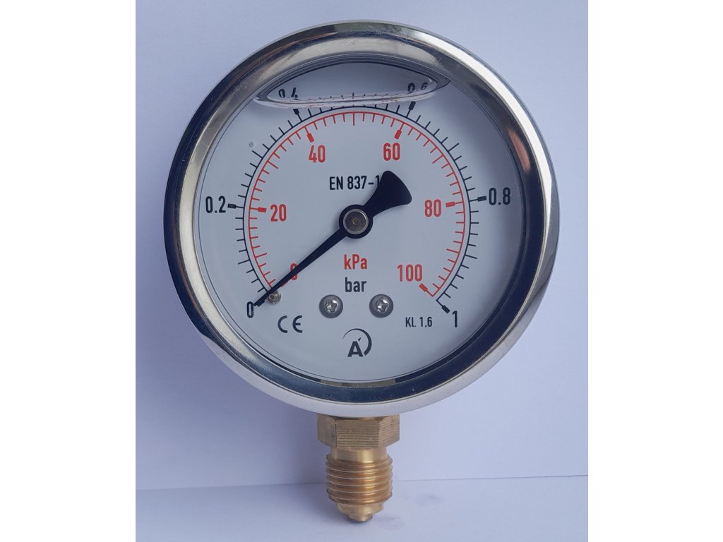 · Průměr pouzdra 63mm· Připojení spodní (radiální)· Kapalinové tlumení (glycerín)· Třída přesnosti 1,6· Závit G 1/4”· Stupnice v barech a pascalech (dvojitý číselník)· Pouzdro AKC – nerez 1.4301· rozsah 0-1 bar/0-100 kPa· Průzor plast· Číselník Al, podklad bílý, stupnice černá a červená· Ukazovatel Al, barva černá· Strojek CuZn (Ms)· Měřící systém trubkové péro, legovaná slitina mědi· Krytí IP65