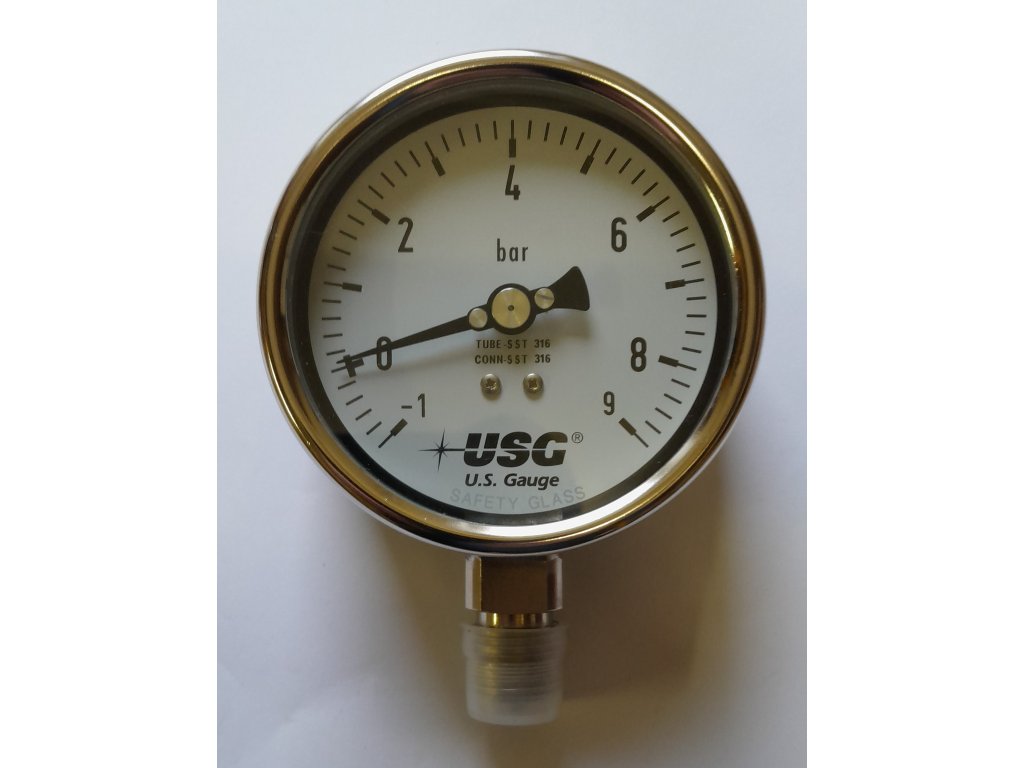 Celonerezový manometr· Průměr pouzdra 100 mm· Připojení spodní (radiální)· Třída přesnosti 1,6%· Závit G 1/2”· Rozsah -1...+ 9 bar (manovakuometr)· Stupnice v barech· Pouzdro AKC – ocel DIN 1.4301· Kroužek bajonetový· Průzor sklo (safety glass)· Číselník Al, podklad bílý, stupnice černá (bar) · Ukazovatel Al, barva černá· Strojek 1.4571· Měřící systém trubkové péro, 1.4571· Krytí IP 54· Možnost glycerinového plnění