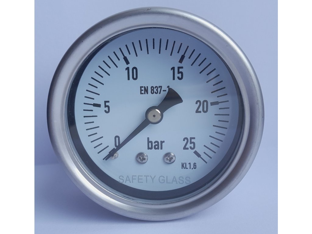 · Celonerezový manometr· Průměr pouzdra 63 mm· Připojení zadní (axiální)· Třída přesnosti 1,6· rozsah 0-25 bar· Závit G 1/4”· Stupnice v barech· Pouzdro AKC – ocel DIN 1.4301· Kroužek bajonetový· Průzor sklo (safety glass)· Číselník Al, podklad bílý, stupnice černá· Ukazovatel Al, barva černá· Strojek 1.4571· Měřící systém trubkové péro, 1.4571· Krytí IP 54· bez náplně s možností plnění glycerinem