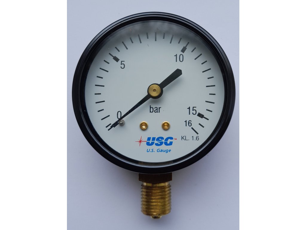 Průměr pouzdra 63 mm· Připojení spodní (radiální) se závitem G1/4· Třída přesnosti 1,6%· Rozsah 0-16 bar· Stupnice v barech· Pouzdro ocel-černý lak· Průzor sklo· Číselník Al, podklad bílý, stupnice černá· Ukazovatel Al, barva černá· Strojek CuZn (Ms)· Měřící systém trubkové péro, slitina mědi