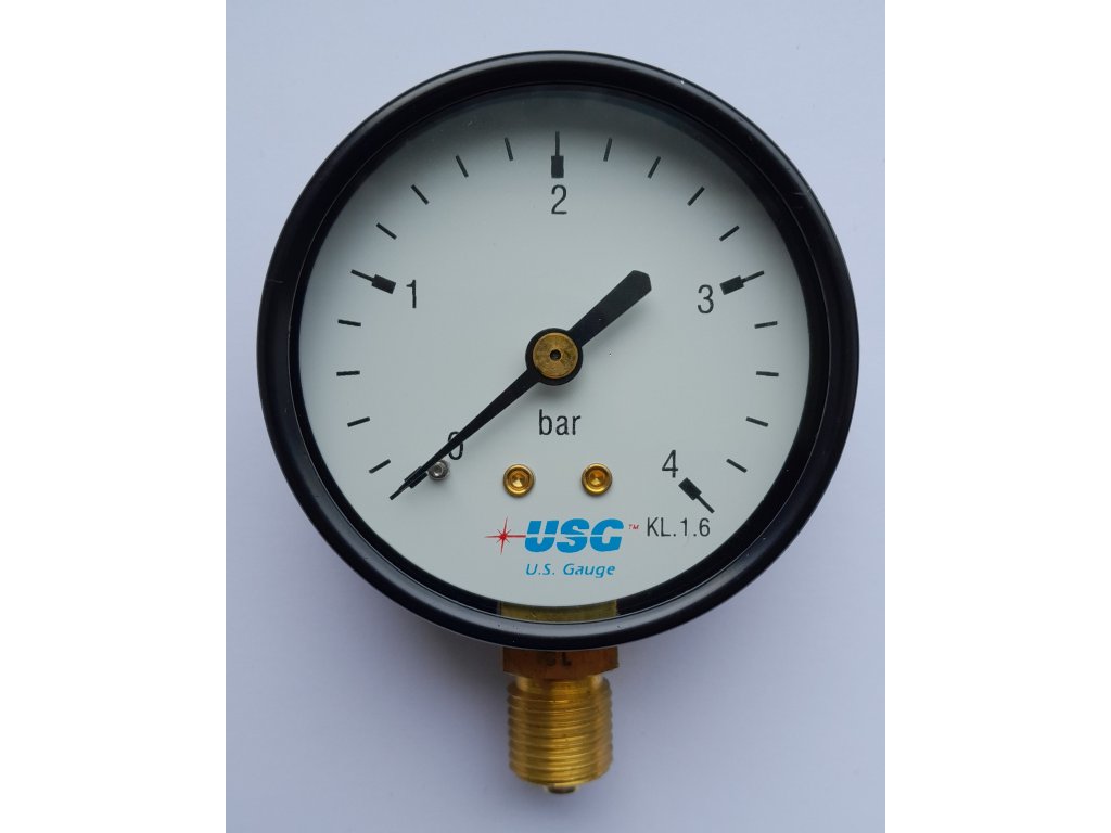 Průměr pouzdra 63 mm· Připojení spodní (radiální) se závitem G1/4· Třída přesnosti 1,6%· Rozsah 0-4 bar· Stupnice v barech· Pouzdro ocel-černý lak· Průzor sklo· Číselník Al, podklad bílý, stupnice černá· Ukazovatel Al, barva černá· Strojek CuZn (Ms)· Měřící systém trubkové péro, slitina mědi