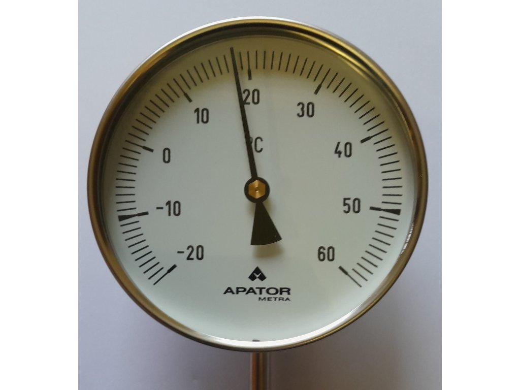 Průměr pouzdra 100mm· Připojení spodní (radiální)· Třída přesnosti 2 (EN 13 190)· Teplotní rozsah -20+60°C· Délka stonku 160 mm· Průměr stonku 8 mm· Hlavice a stonek z nerezové oceli třídy 17· Průzor skleněný· Číselník Al, podklad bílý, stupnice černá· Ukazovatel Al, barva černá· Měřící element bimetal