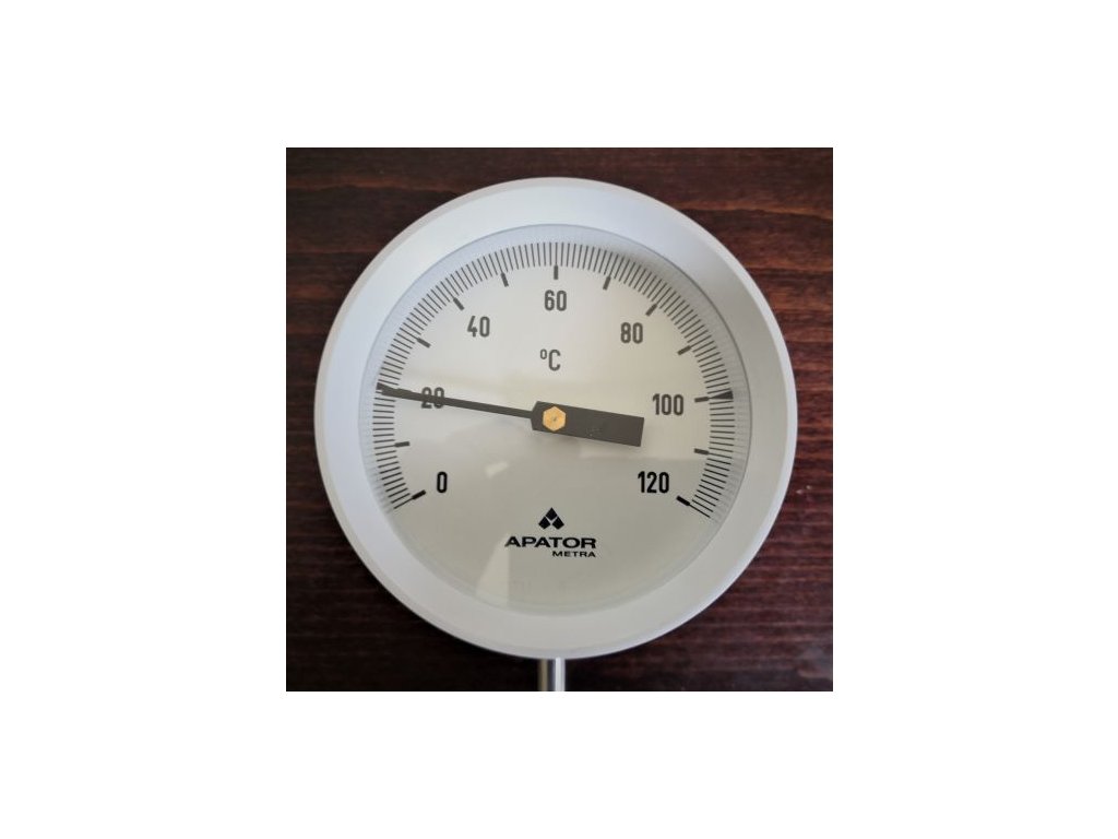 Průměr pouzdra 106 mm· Připojení spodní (radiální)· Třída přesnosti 2 (EN 13 190)· Teplotní rozsah 0-120°C· Délka stonku 160 mm· Průměr stonku 8 mm· Hlavice z plastu, stonek z nerezové oceli třídy 17· Průzor skleněný· Číselník Al, podklad bílý, stupnice černá· Ukazovatel Al, barva černá· Měřící element bimetal