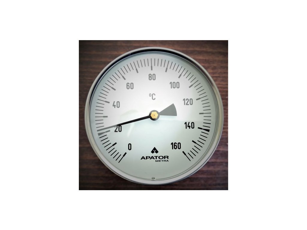 Průměr pouzdra 100 mm· Připojení spodní (radiální)· Třída přesnosti 2 (EN 13 190)· Teplotní rozsah 0-160°C· Délka stonku 250 mm· Průměr stonku 8 mm· Hlavice a stonek z nerezové oceli třídy 17· Průzor skleněný· Číselník Al, podklad bílý, stupnice černá· Ukazovatel Al, barva černá· Měřící element bimetal