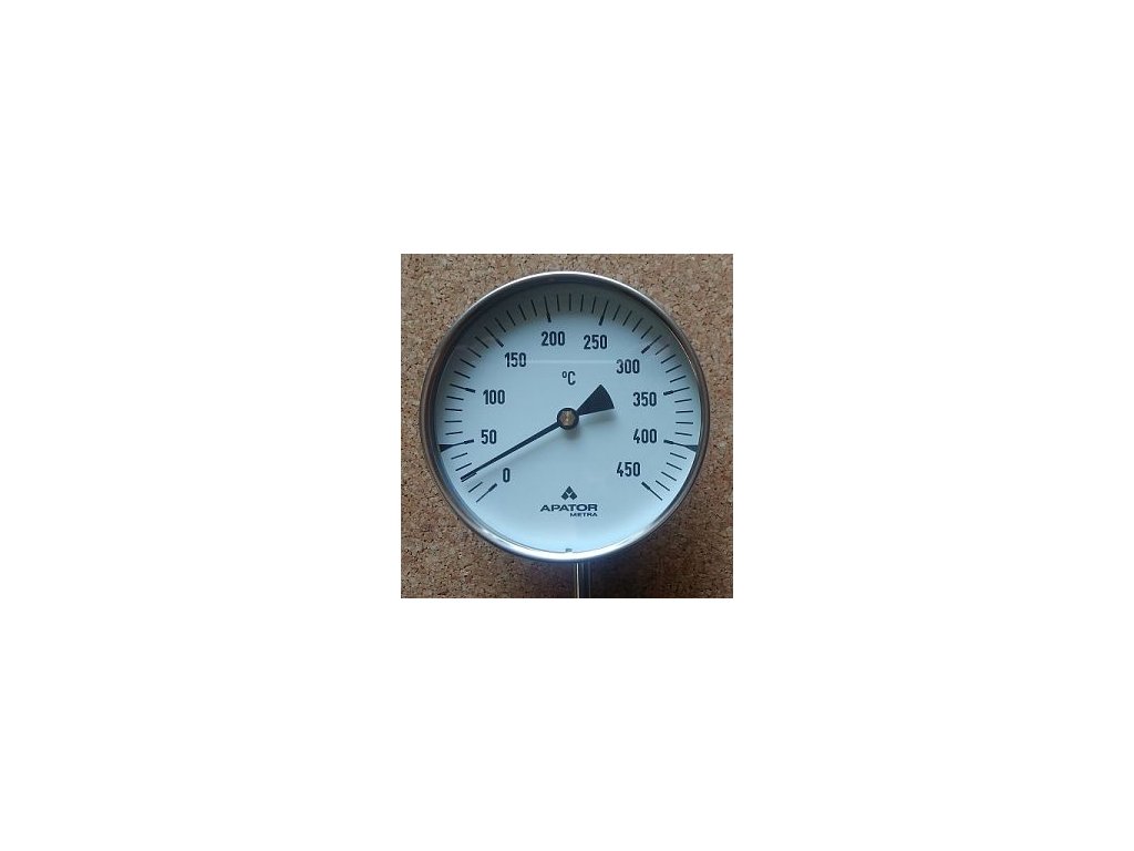 Průměr pouzdra 100 mm· Připojení spodní (radiální)· Třída přesnosti 2 (EN 13 190)· Teplotní rozsah 0-450°C· Délka stonku 160 mm· Průměr stonku 8 mm· Hlavice a stonek z nerezové oceli třídy 17· Průzor skleněný· Číselník Al, podklad bílý, stupnice černá· Ukazovatel Al, barva černá· Měřící element bimetal